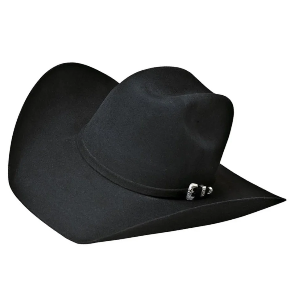 Bullhide presents the Legacy 8X from the Rodeo Round-Up Collection. Featuring fur-blend felt and attractive three-piece metal buckles, a Legacy hat makes a statement like no other. This particular Legacy hat is in the color black, from its cattleman crown and curled brim to its sleek band. Its buckle set is made of gold metal for added flair.