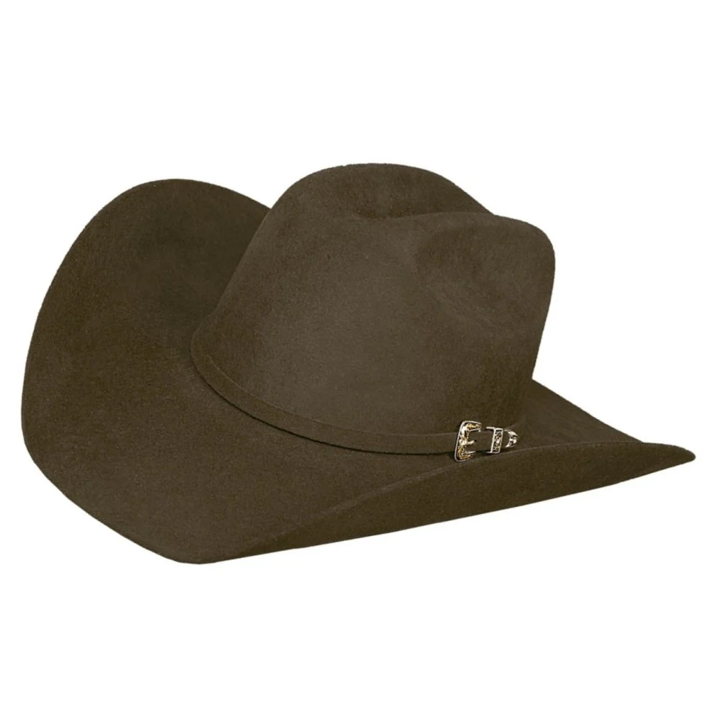 Bullhide presents the Legacy 8X from the Rodeo Round-Up Collection. Featuring fur-blend felt and attractive three-piece metal buckles, a Legacy hat makes a statement like no other. This particular Legacy hat is in the color chocolate brown, from its cattleman crown and curled brim to its sleek band. Its buckle set is made of gold metal for added flair.