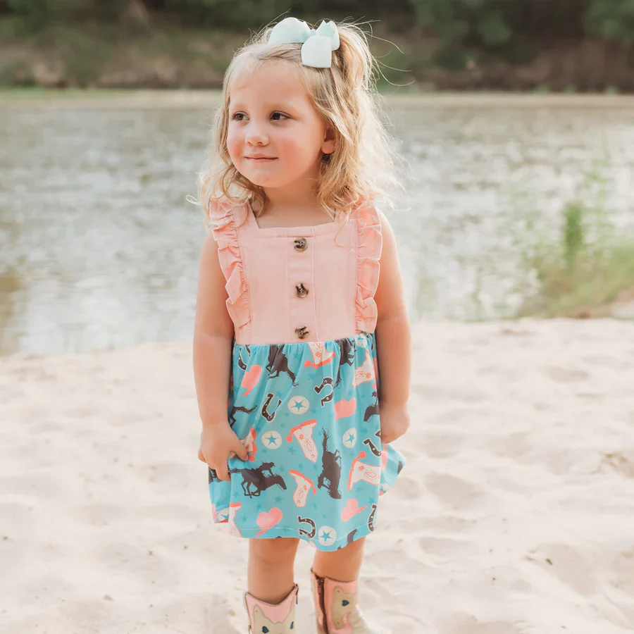 Dress your little cowgirl in style with our Shea Baby Girls Pink Denim and Turquoise Dress – a perfect blend of sweetness and charm! The soft pink denim of this dress adds a touch of elegance to your baby girl's look. It's perfect for any occasion. The lovely turquoise blue gives this dress a playful and vibrant feel. It's like a pop of color that's as refreshing as a summer breeze.