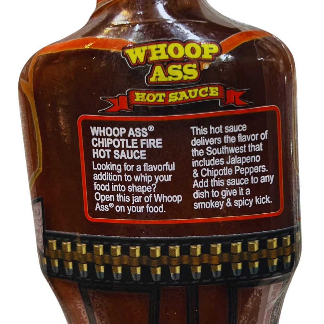 This Whoop Ass hot sauce delivers the flavor of the Southwest that includes Jalapeno & Chipotle peppers. Add this 5.6-ounce bottled sauce to any dish to give it a smokey & spicy flavor.